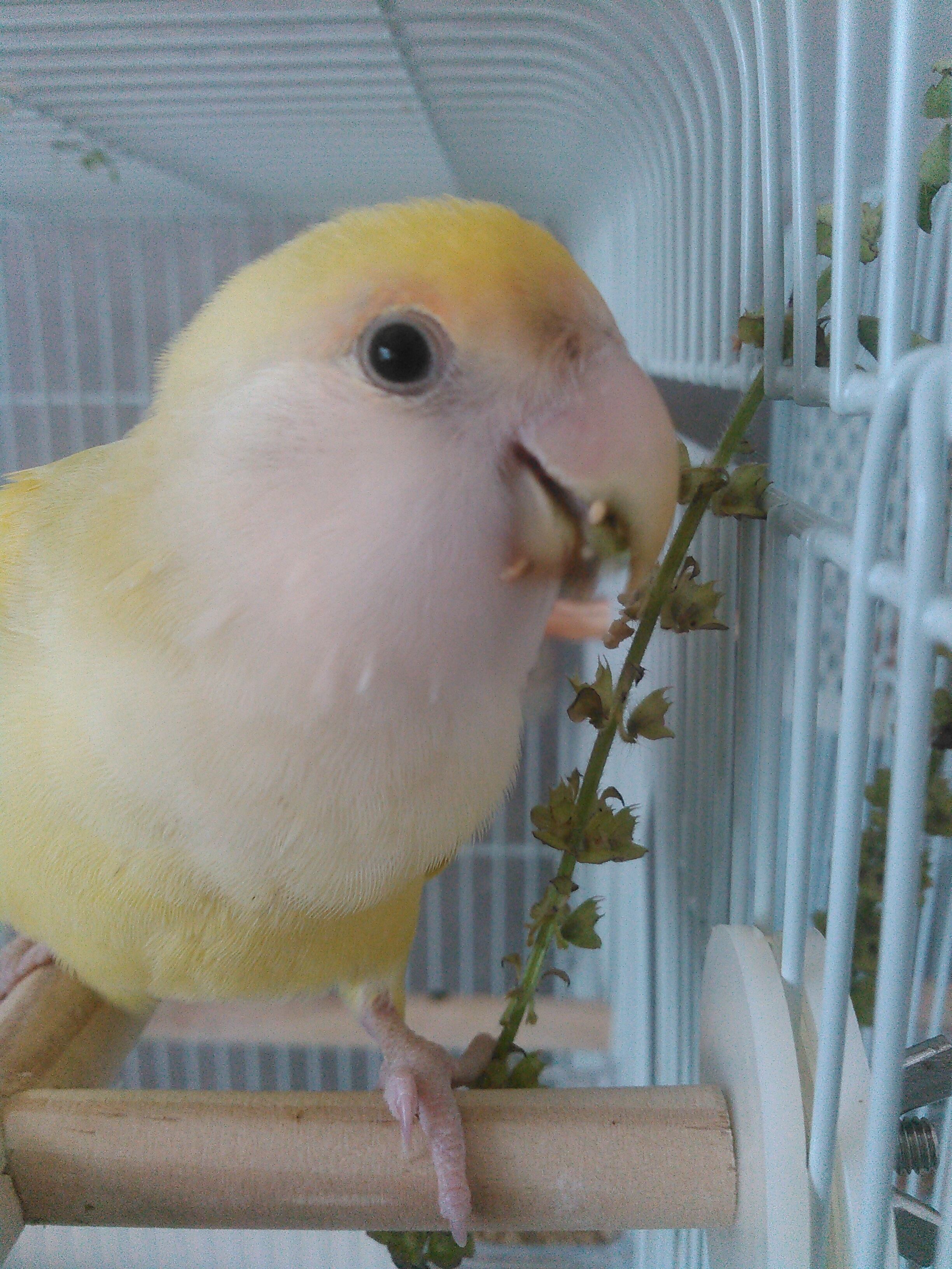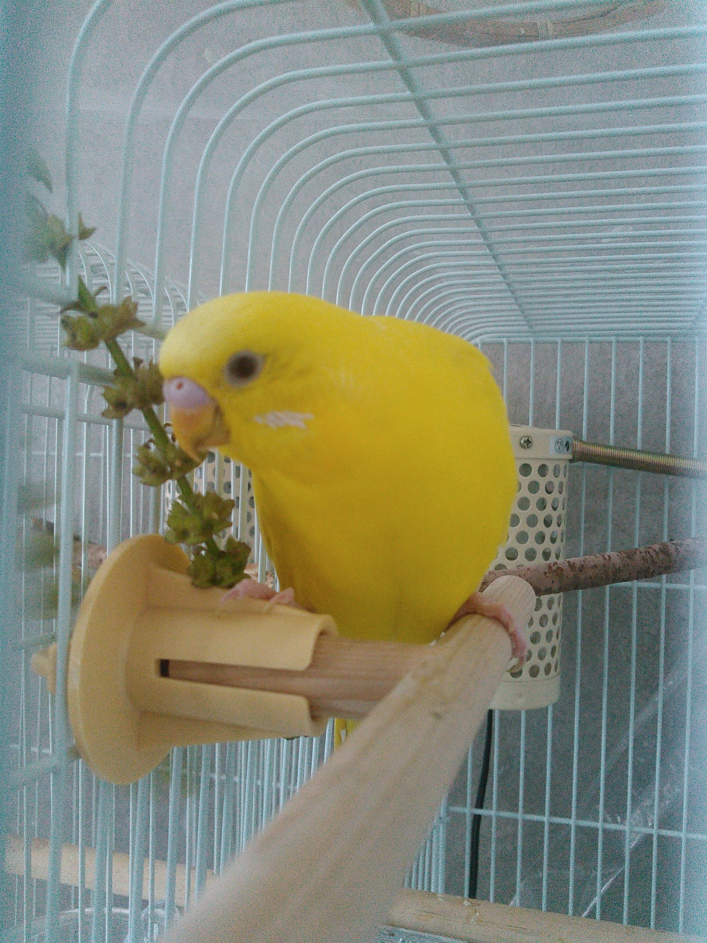 鳥さんの食後は鳥かご、鳥さんからホーリーバジルの香りが漂ってきて癒されます。